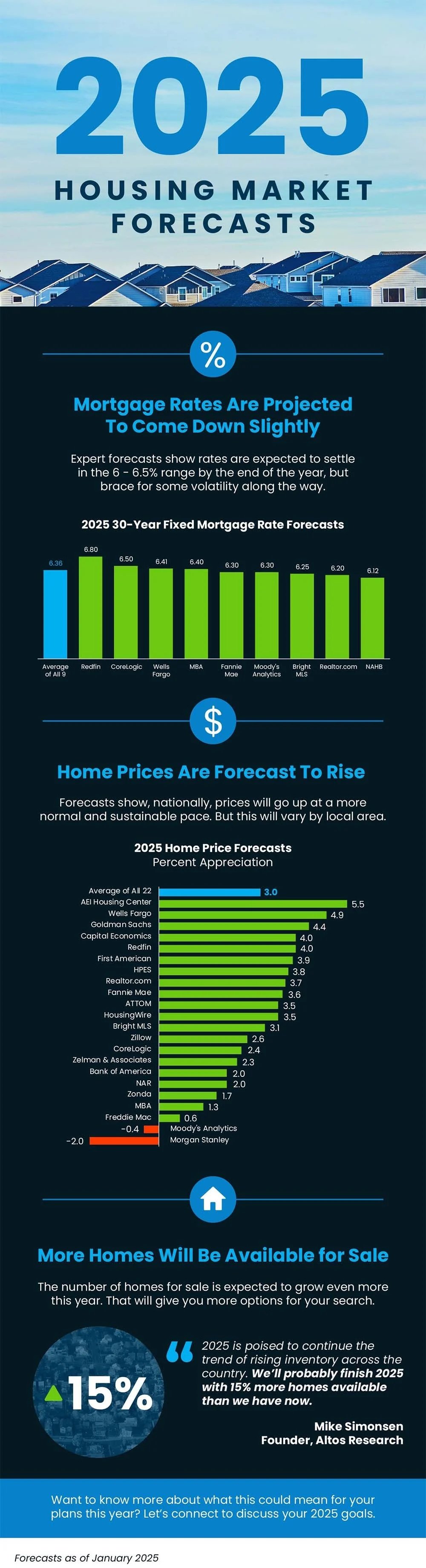 Wondering what to expect when you buy or sell a home this year? Here’s what the experts say lies ahead. Mortgage rates are projected to come down slightly. Home prices are forecast to rise in most areas. And, there will be more homes available for sale. Want to know more about what this could mean for your plans this year? Let’s connect to discuss your 2025 goals.