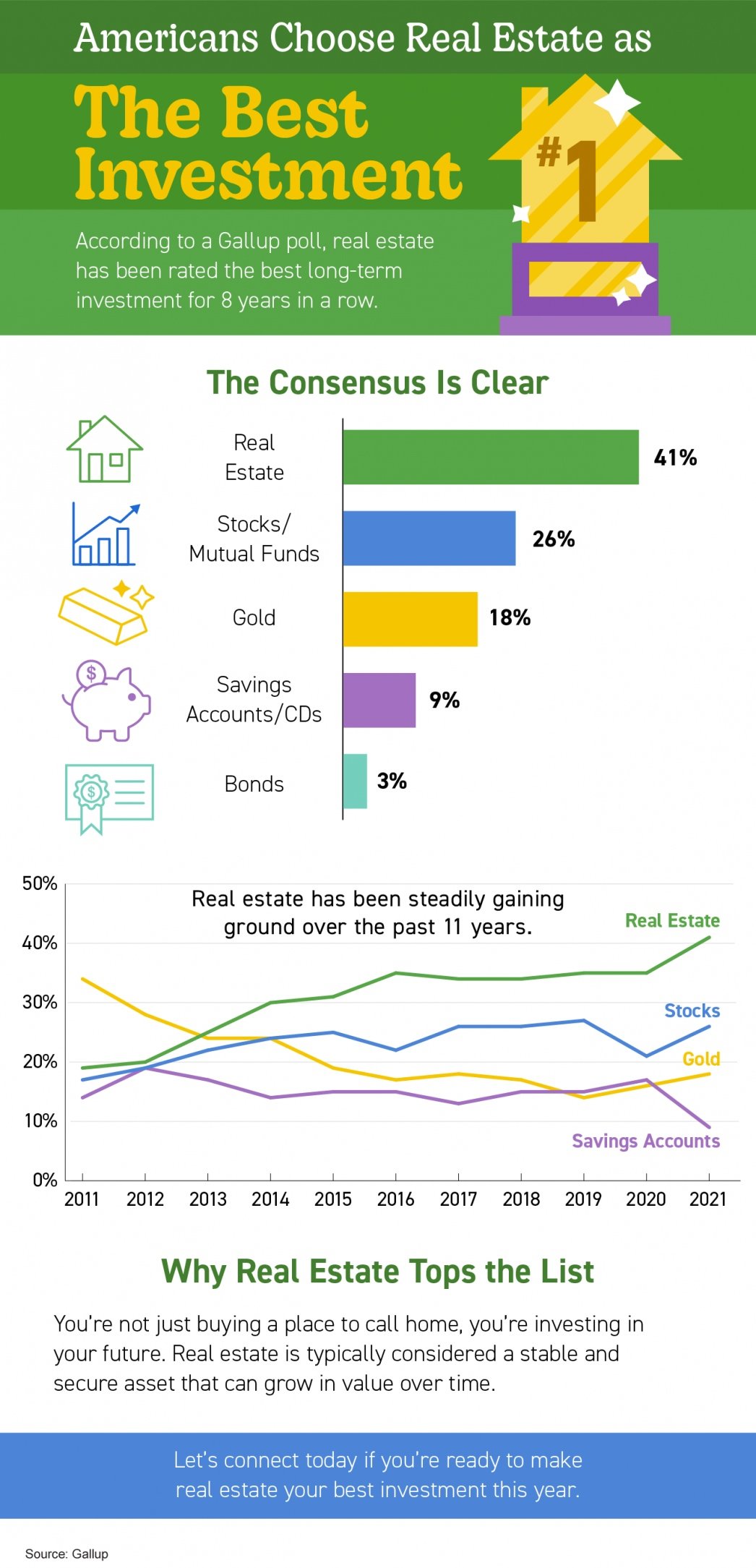 According to a Gallup poll, real estate has been rated the best long-term investment for eight years in a row. Real estate tops the list because you’re not just buying a place to call home – you’re investing in your future.