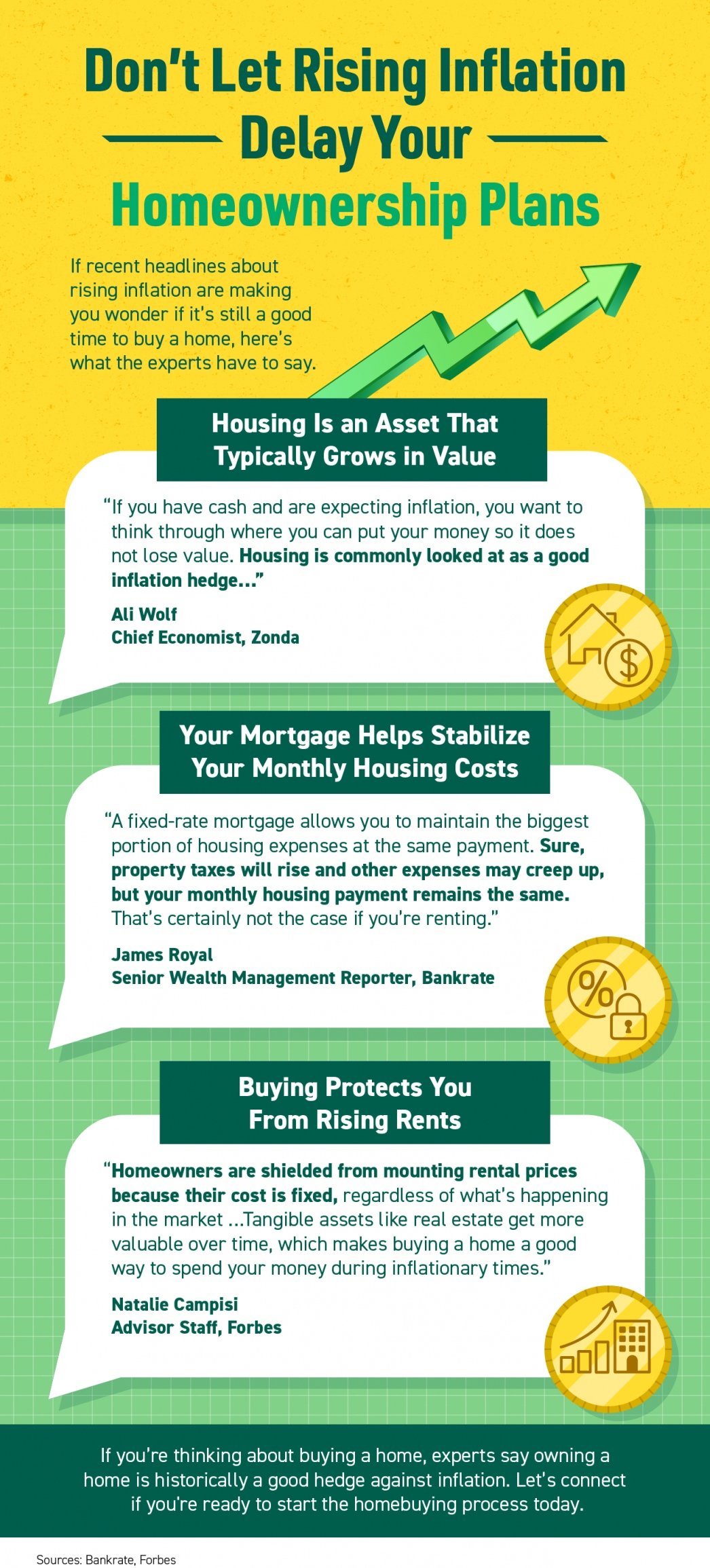 If recent headlines about rising inflation are making you wonder if it’s still a good time to buy, here’s what experts have to say. Housing is an asset that typically grows in value. Plus, your mortgage helps stabilize your monthly housing costs, and buying protects you from rising rents. Experts say owning a home is historically a good hedge against inflation. Let’s connect if you’re ready to start the homebuying process today.