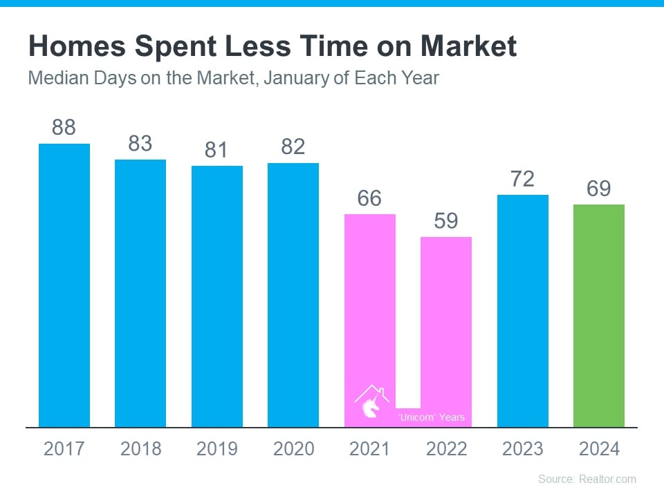 When you look at the most recent data (shown in green), it's clear homes are selling faster than they usually would (shown in blue). In fact, the only years when houses sold even faster than they are right now were the abnormal ‘unicorn’ years (shown in pink).