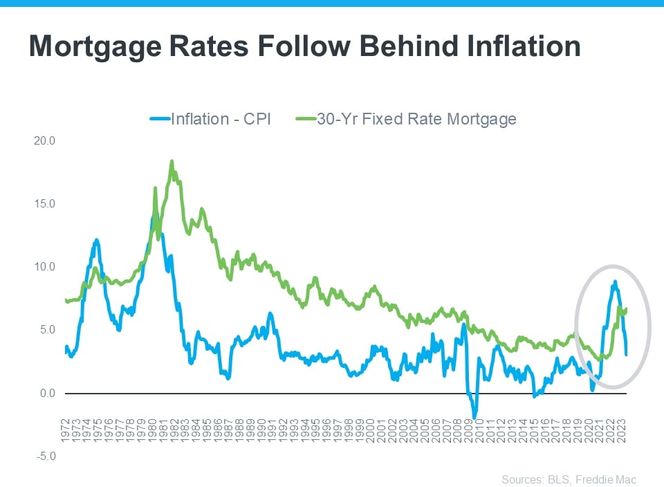 As the data above shows, inflation (shown in the blue trend line) is slowly coming down and, based on historical trends, mortgage rates (shown in the green trend line) are likely to follow.