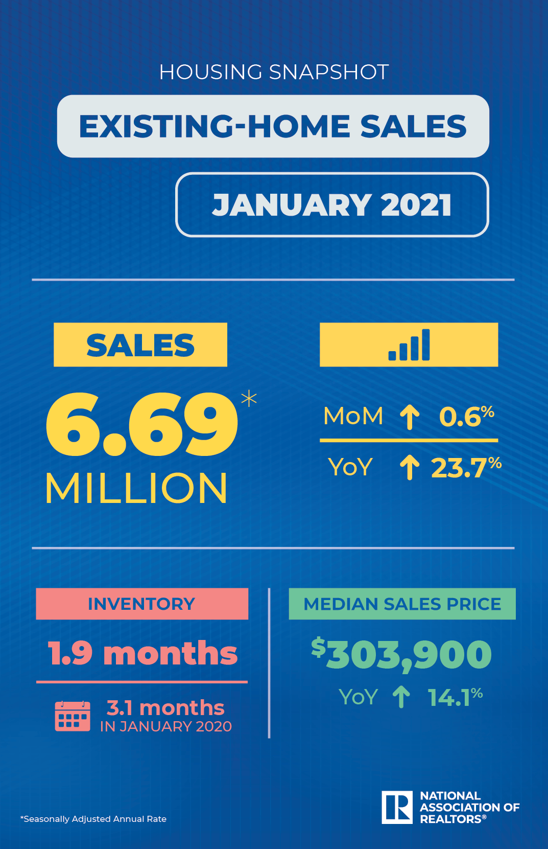 - Existing-home sales continued to increase in January to a seasonally-adjusted annual rate of 6.69 million, up 0.6% from the prior month and 23.7% from one year ago.