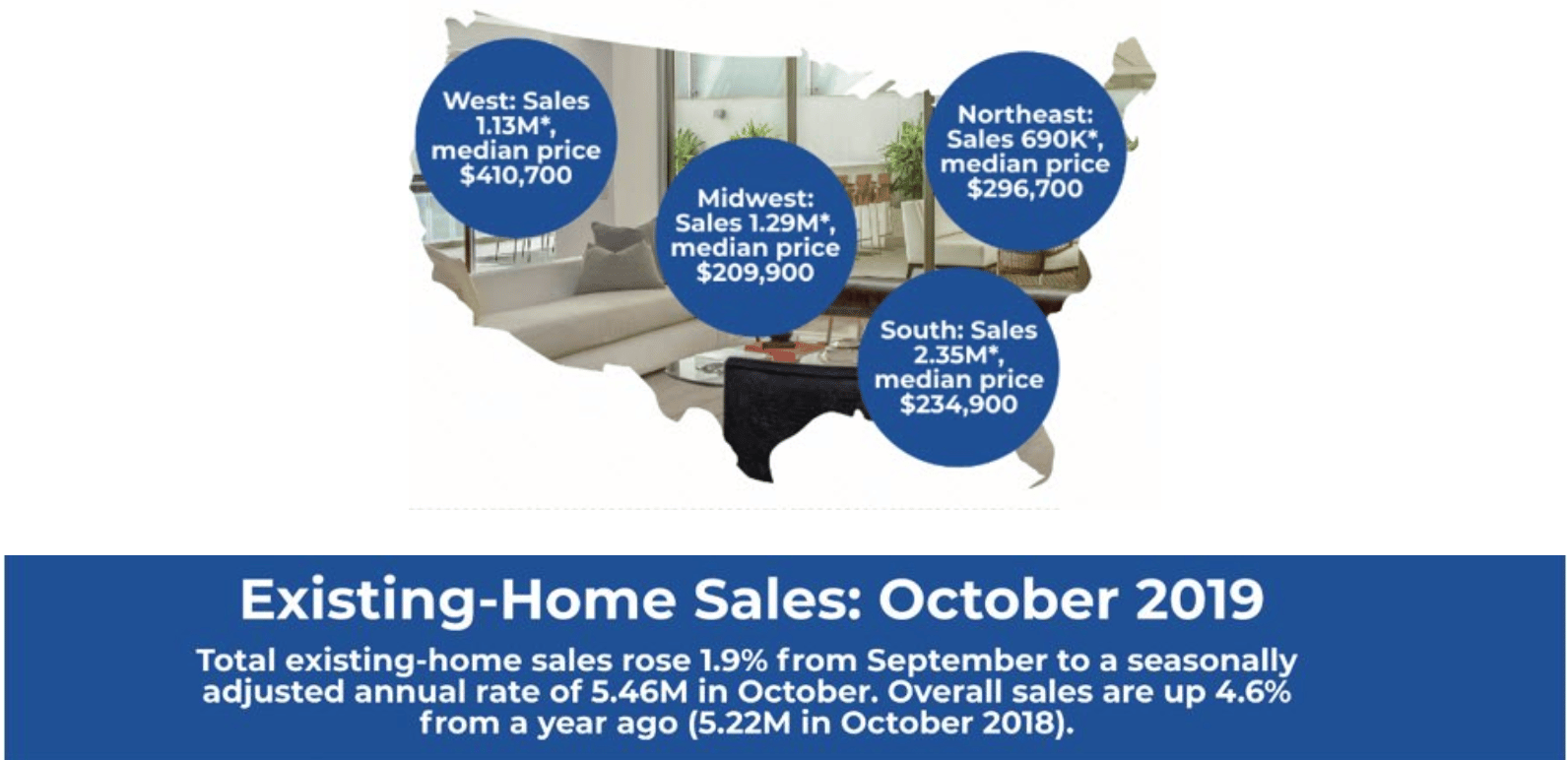 The median existing-home price for all combined U.S. housing types in October was $270,900, up 6.2% from October 2018 ($255,100), as prices rose in all regions.