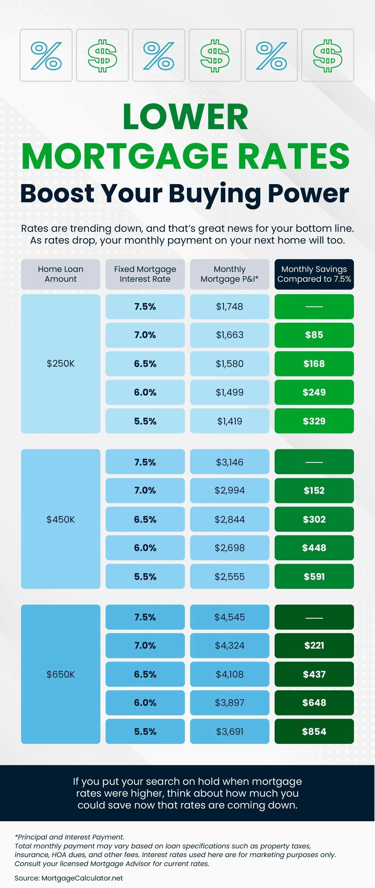 Mortgage rates are trending down and that’s great news for your bottom line. As rates drop, your monthly payment on your next home does too. Even a small change in mortgage rates can have a big impact on your purchasing power. If you put your search on hold when mortgage rates were higher, think about how much you could save now that rates are coming down.
