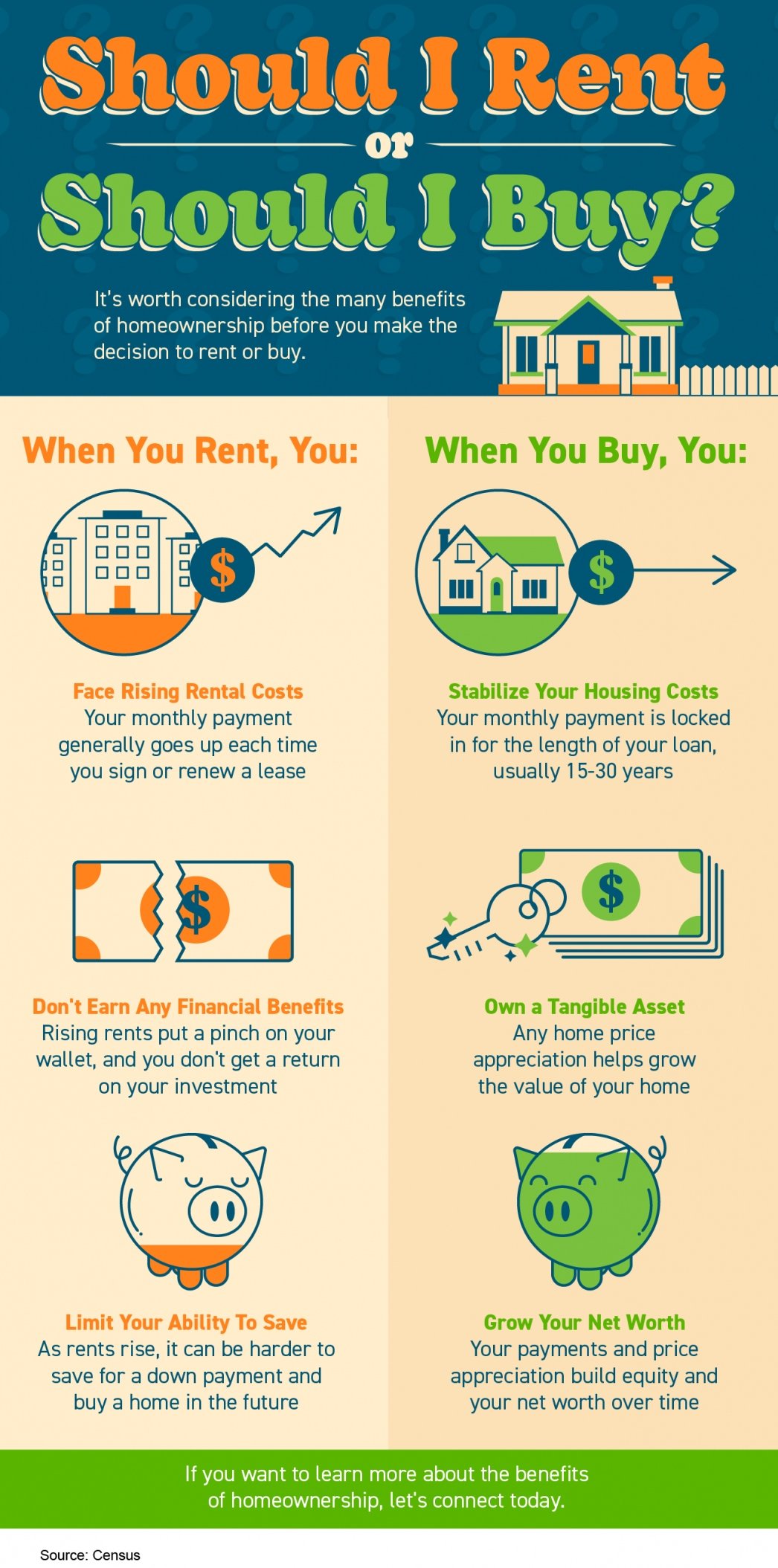 It’s worth considering the many benefits of homeownership before you make the decision to rent or buy a home. When you buy, you can stabilize your housing costs, own a tangible asset, and grow your net worth as you gain equity. When you rent, you face rising housing costs, won’t see a return on your investment, and limit your ability to save. If you want to learn more about the benefits of homeownership, let’s connect today.