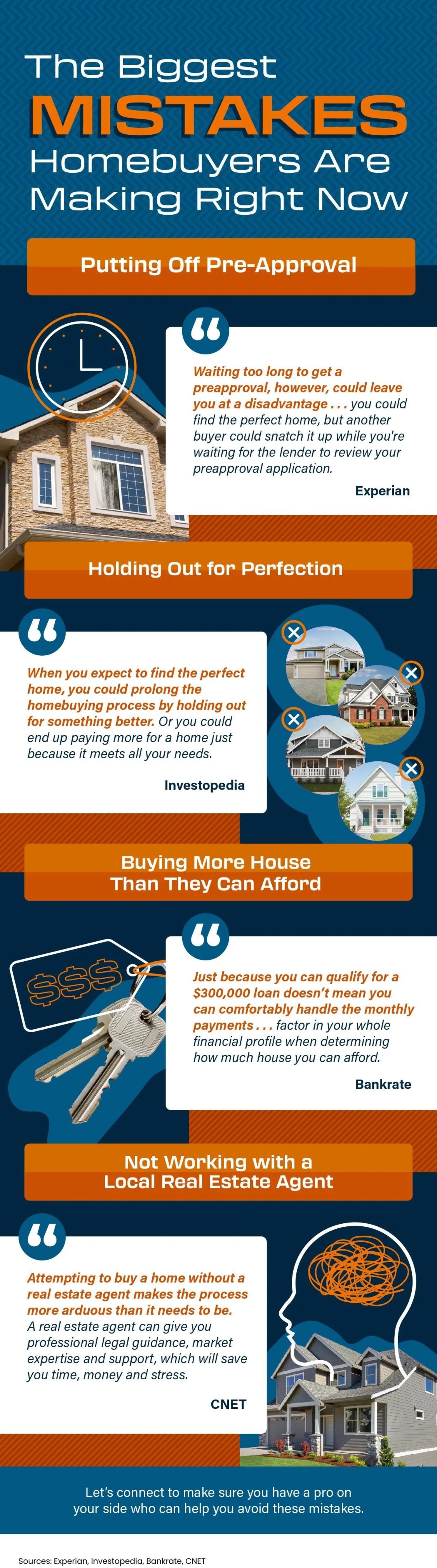 Want to know the biggest mistakes homebuyers are making today? They include everything from putting off pre-approval for too long, holding out for the perfect home, buying more than they can afford, and skipping out on hiring a pro. Let’s connect to make sure you have a pro on your side who can help you avoid these mistakes.