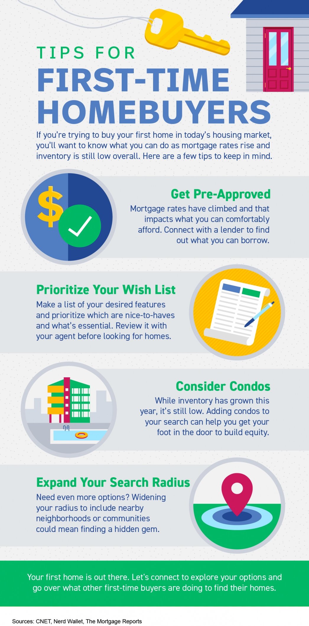 If you’re trying to buy your first home in today’s housing market, you’ll want to know what you can do as mortgage rates rise and inventory stays low overall. Connect with a lender to get pre-approved, prioritize your wish list, consider condos, and expand your search radius. Your first home is out there. Let’s connect to explore your options and what other first-time buyers are doing to find their homes.