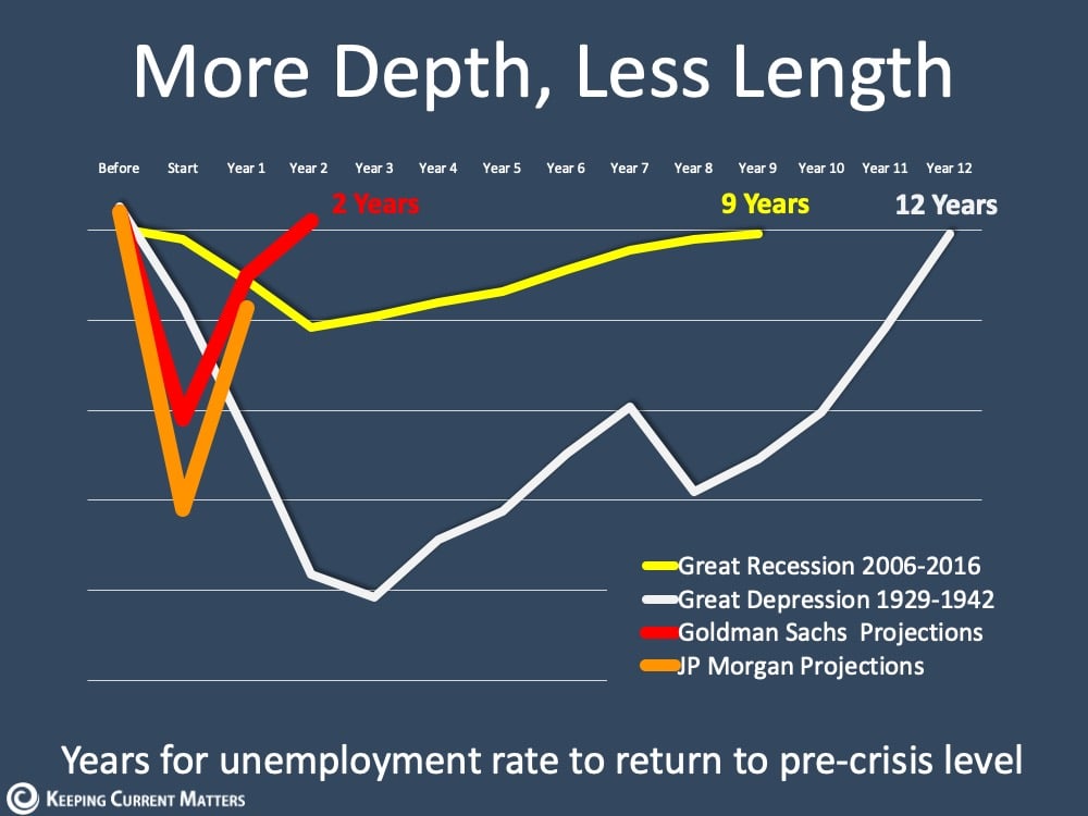 Most experts predict that while unemployment is high right now, it won’t be that way for long. The length of unemployment during this crisis is projected to be significantly shorter than the duration seen in the Great Recession and the Great Depression.
