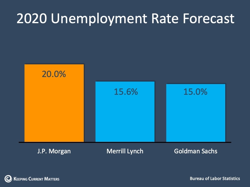 Last month’s report indicated we initially lost over 700,000 jobs in this country, and the unemployment rate quickly rose to 4.4%. With the release of the new data, that number will climb even higher. Experts forecast this report will show somewhere between a 15% – 20% national unemployment rate, and some anticipate that number to be even greater (see graph below):