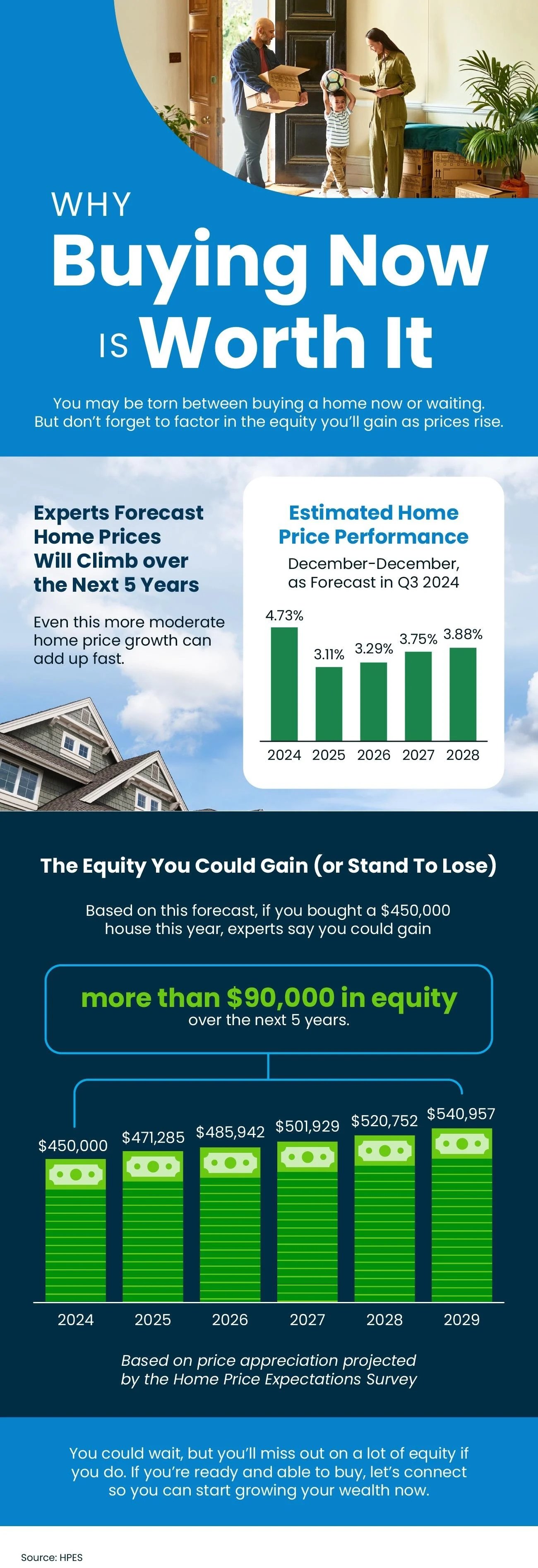 You may be torn between buying a home now or waiting. But don’t forget to factor in the equity you’ll gain as prices rise. Experts forecast prices will climb over the next 5 years – and based on those forecasts, you could gain about $90k in equity in that time. So, you could wait, but you’ll miss out on a lot of equity if you do. If you’re ready and able to buy, let’s connect so you can start growing your wealth now.