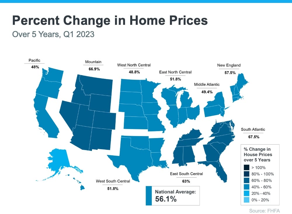 If you look at the percent change in home prices, you can see home prices grew on average by just over 56% nationwide over a five-year period. Some regions are slightly above or below that average, but overall, home prices gained solid ground in a short time.