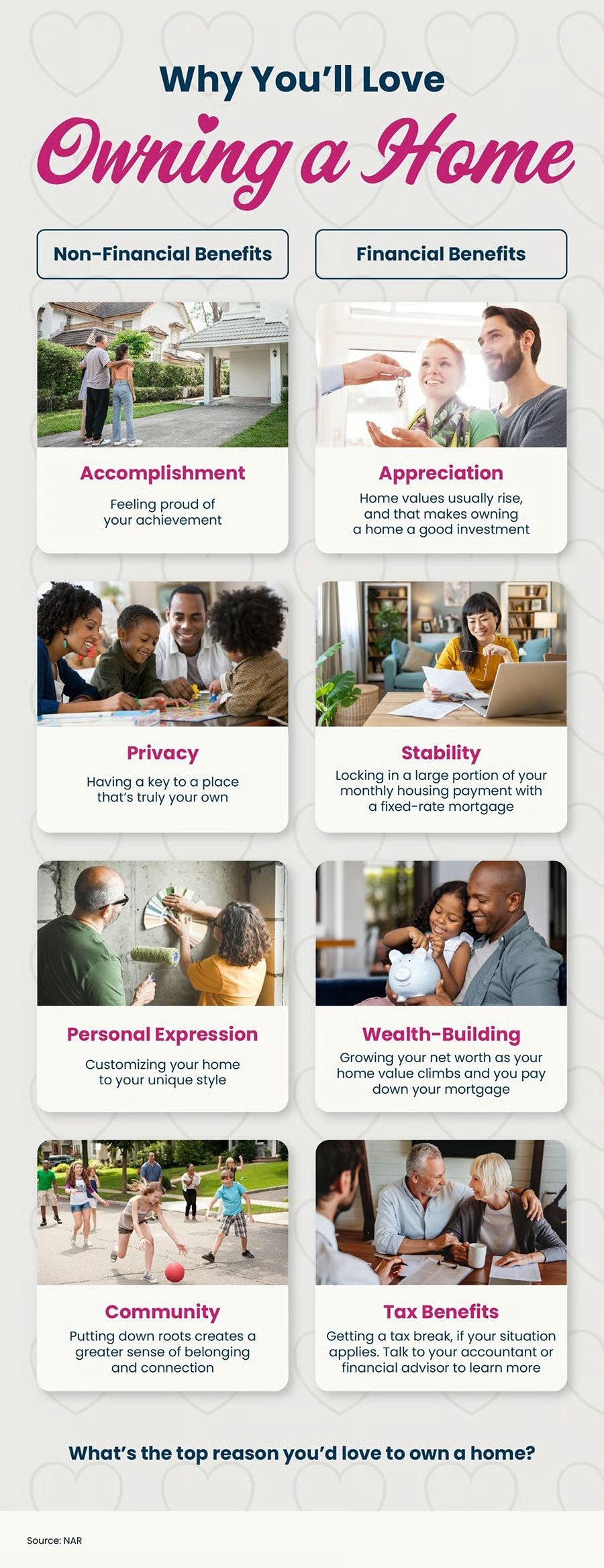 Owning a home comes with many benefits, both non-financial and financial. From the sense of accomplishment and freedom of expression to growing your net worth, it’s easy to fall in love with homeownership. What’s the top reason you’d love to own a home? Let me know, and we’ll come up with a plan that makes it possible.