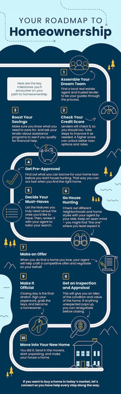 Buying a home isn’t just a transaction – it’s a journey. And like any great adventure, having a solid roadmap makes all the difference. From building your dream team to getting pre-approved, house hunting, and signing the papers on closing day – each milestone is an achievement. Your journey starts here. Let’s connect so you have help every step along the way.